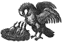 ORPHAN BIRD – The Bestiaries describe the mythical orphan bird as a bird with the neck, chest and crest of a peacock, the beak of an eagle, the body of a crane and the legs of a swan. Its wings are said to be black, red and white. When the bird lays her eggs, she lays them right on the water. The eggs with good chicks float on the surface while the eggs with bad chicks sink to the bottom. When the eggs hatch, the good chicks join their mother. She immediately takes them to meet their father. The bad chicks are forced to live in darkness and despair. The story has deep symbolism. The mother bird is Jesus. The eggs symbolize all of the people on the earth. When the eggs hatch, the good people stay close to Him. The bad people sink in their sins. On judgment day, Jesus takes the good people to God the Father.