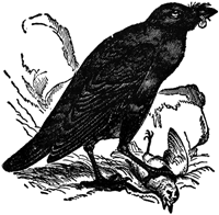 3. The raven symbolizes God’s providence. When Elijah was in hiding in the wilderness, God sent ravens with meat to feed him (I Kings 17:6). 4. In modern times, a raven is the symbol of ill-fortune. 5. The Bestiaries tell us that when a raven begins to eat a corpse, it starts by pecking out the eyes so as to get to the brain. This symbolizes the acts of Satan, who sets out to destroy a person’s ability to perceive sin. 6. According to the writings of St. Augustine, every time the raven speaks it says “cras, cras” meaning, in Latin, “Tomorrow, tomorrow.” In this sense the raven symbolizes Satan, who is trying to get every non-believer to put off making a commitment to Jesus until tomorrow.