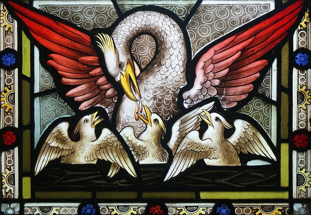 When viewing the pelican, they noticed it had a red tip on its long bill. When the pelican started to prune its feathers, it appeared to be ripping open its breast so as to feed its young with its own blood. The Bestiaries greatly exaggerate this myth. They tell us that the young pelicans will strike at their parents. The pelican strikes back so hard it kills the young birds. After three days, the female pelican pierces her side or breast and lets her blood fall on the dead pelicans. The blood revives them to life. The pelican story was a The pelican story was a perfect symbol for the Atonement, where Jesus allowed Himself to be pierced so that we may live. The pelican was a very popular symbol during the Middle Ages.